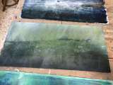 Le travail s’effectue donc par couches successives, un délai de séchage étant nécessaire entre chaque séance, où les peintures sur papier doivent être mises sous presse. A chaque séance s’entame donc un dialogue entre nous et les peintures sur ce qui a été fait la fois précédente, sur la façon dont la perception a été modifiée par le séchage, mais aussi par l’humeur du jour, par ce qu’il faut ou non apporter pour améliorer l’ensemble, par l’interrogation « est-ce terminé ou non ? ».